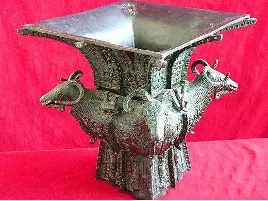 四羊方尊,商朝晚期青铜礼器,祭祀用品。1938年出土于湖南宁乡县黄材镇月山铺转耳仑的山腰上。被誉为中国青铜铸造史上最杰出的作品。