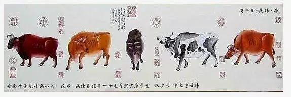 韩滉《五牛图》卷是少数几件唐代传世纸绢画作品真迹之一,也是现存最古的纸本中国画,因而受到广泛重视,堪称“镇国之宝”。《五牛图》画在一张窄而长的桑皮纸上,五牛姿态各异、身形逼肖,全图除了一丛荆棘之外,不设任何背景,着重突出牛的既倔强又温顺的性格。