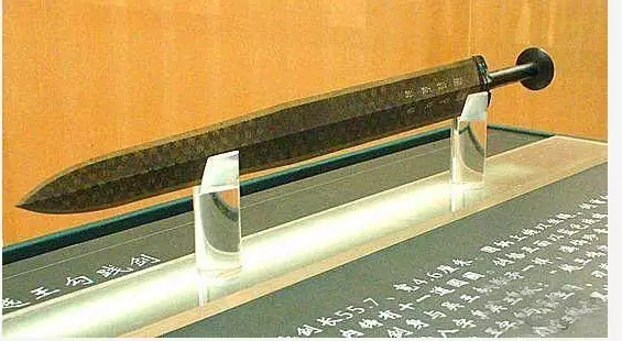 越王勾践剑,剑身修长,有中脊,两从刃锋利,前锋曲弧内凹。宽格上铸阳文鸟篆书“越王鸠践,自作用剑”。茎上两道凸箍,圆首饰同心圆纹,铸工精湛,被称为“天下第一剑”。
