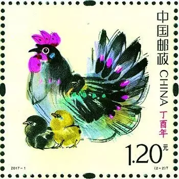 《丁酉年》鸡票一套两枚,第一张“意气风发”,为一只奋起奔跑的雄鸡形象,象征中国的快速发展;第二张“丁酉大吉”,为一只母鸡呵护两只小鸡的“合家欢”形象。全套邮票表现的是生肖鸡幸福美满的一家子,既突出了雄鸡起舞、大吉大利的生肖贺岁主题,又展现了和谐团圆的家庭生活。在网上,有集邮爱好者形象地称这套鸡票“鼓励生二孩”。