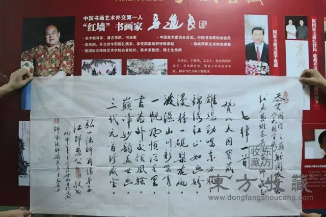 一直以来,姜增巨先生收藏书画多年,自己在书法上也颇有造诣。在活动现场感受到吴进良大师的书画魅力后,便在活动现场立刻收藏了一套吴进良大师代表作《国礼之巅·大国宝藏》。由于对大师作品爱不释手,姜先生亲作一首《七律》诗词赠予东方收藏,以表达对吴进良大师作品的喜爱之情。