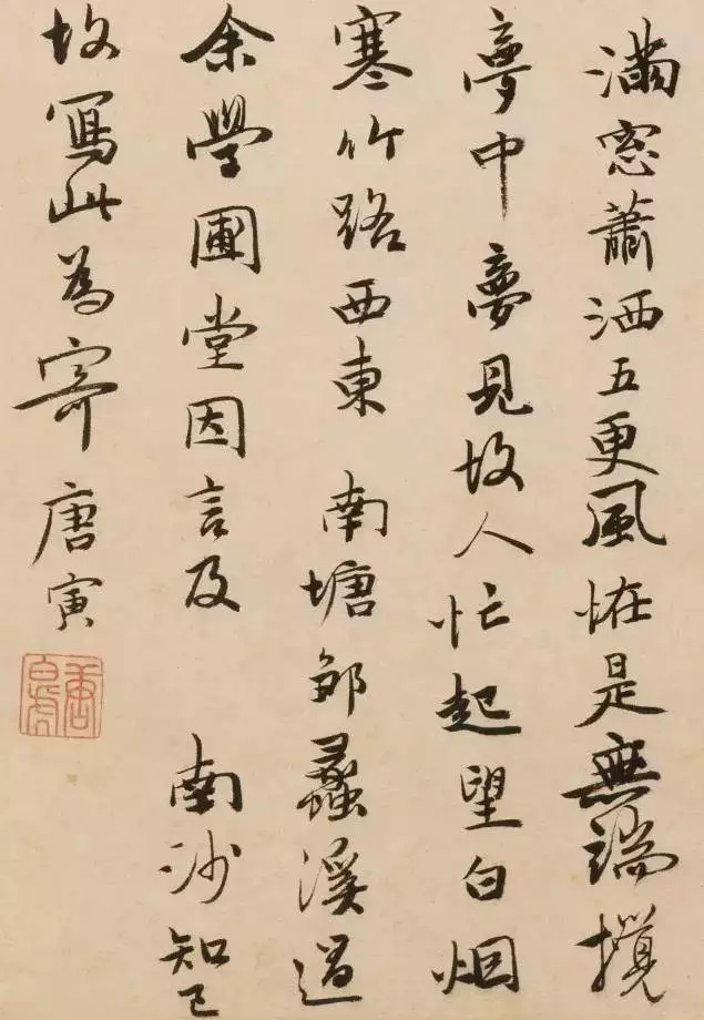 释文:满窗潇洒五更风,怪是无端搅梦中。梦见故人忙起望,白烟寒竹路西东。南塘邹蠡溪过余学圃堂,因言及 南沙知己,故写此为寄。唐寅。
