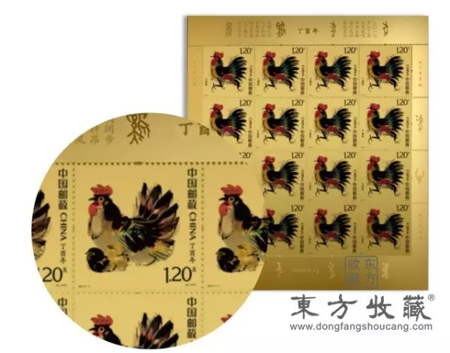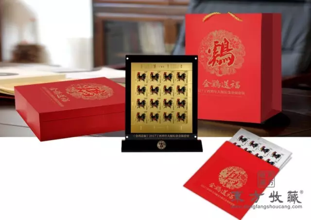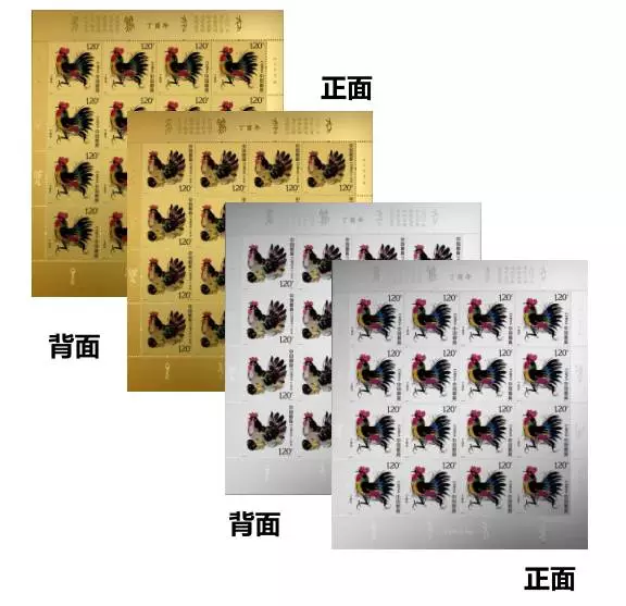 中国邮政集团公司天津市分公司以2017丁酉年两版生肖鸡票为蓝本,以999纯金1:1等比例打造,运用顶级彩金工艺,结合德国镭射微雕双面雕刻技术,创造性地将2017《丁酉年》两版邮票合二为一,正背面展示。