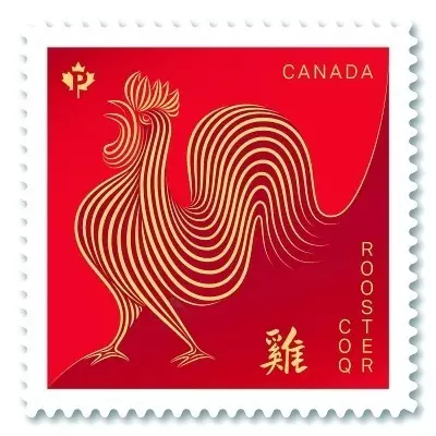 加拿大鸡票主体以中国红作为主色调,以流畅线条塑造金鸡昂扬向上的形象,同时将加拿大枫叶元素添加其中,邮票整体既有传统韵味,又不失动感。