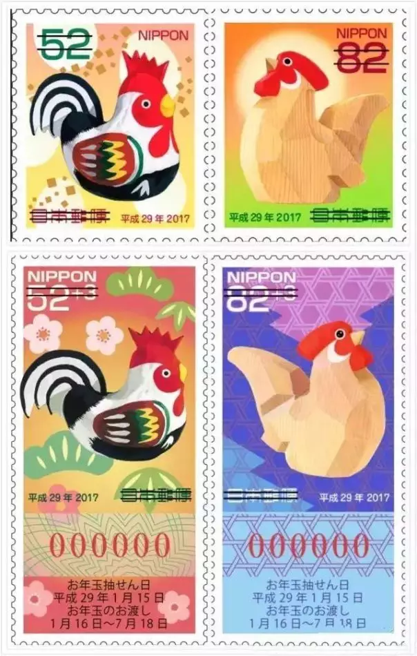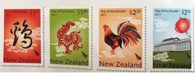 新西兰2017年生肖鸡票一共四枚,分别以草书“鸡”字、剪纸鸡、大公鸡以及灯笼建筑作为主体造型。