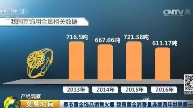 春节黄金饰品销售火爆 我国黄金消费量连续4年世界第一 今年春节,黄金饰品的消费情况如何?近些年首饰用金量为何又遭遇不断起伏? 专家调查:春节期间,无论是无论是手镯手链、项链吊坠,还是金条、金箔、金银邮票,都迎来了一年中的旺季。购买者普遍认为,送黄金,寓意着送吉祥、送祝福,传递美好。 据中国黄金协会最新统计数据显示,回顾过去四年,中国的首饰用金量波动很大,从2013年到2016年,分别是716.5吨、667.06吨、721.58吨和611.17吨,呈现宽幅震荡走势。 .png)