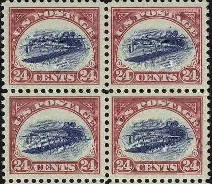 “倒置的珍妮”发行于1918年,是美国发行的第一枚航空邮票。由于印刷错误,邮票上的飞机“珍妮”的图案印倒了,使之成为珍贵的错体邮票。