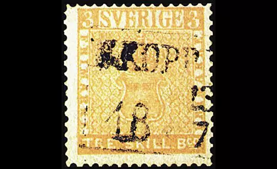 “黄色三先令”是瑞典1855年印刷的错版邮票,原定其印刷颜色应为绿色,黄色应为八先令邮票的颜色,是世界闻名的错色邮票。
