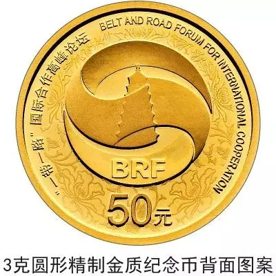 3克圆形金质纪念币背面图案为“一带一路”国际合作高峰论坛标识,衬以缠枝莲吉祥图案组合设计,并刊“一带一路”国际合作高峰论坛中、英文字样及面额。