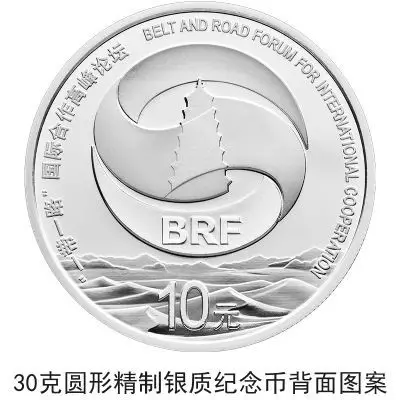 30克圆形银质纪念币背面图案为“一带一路”国际合作高峰论坛标识,配以沙漠、远山图形元素组合设计,并刊“一带一路”国际合作高峰论坛中、英文字样及面额。