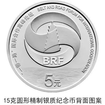 15克圆形银质纪念币背面图案为“一带一路”国际合作高峰论坛标识,配以海水波纹图形元素组合设计,并刊“一带一路”国际合作高峰论坛中、英文字样及面额。