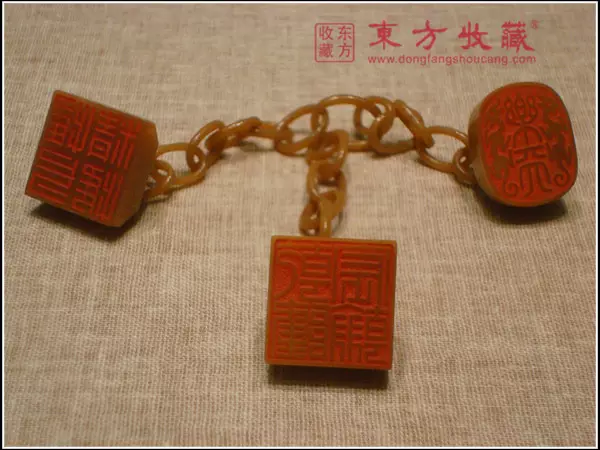 两枚方形,一枚椭圆,以田黄玉链连接,玺文一阴二阳,雕有“乾隆宸翰”、“惟精惟一”和“乐天”,饰以螭纹,石质晶莹剔透,润泽如脂,刻工精细,是印玺中难得一见的珍品。