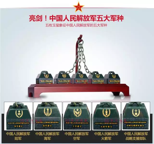 《玺连五军·盛世徽宝》的五尊玉玺分别为:“海军徽宝”、“陆军徽宝”、“空军徽宝”、“火箭军徽宝”、“战略支援部队徽宝”。代表的是中国人民解放军的五大军种分别是:陆军、海军、空军、火箭军和战略支援部队。