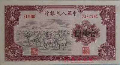 第一套人民币是少有的超大面值,其中面值最大就足足有一万元面值,因其正面是一幅牧马图,也被称为“牧马钞”。牧马钞发行于1951年,根据记载,这版人民币仅上市流通了3年多,如今市场存量非常稀少,当前还未见有全品相出现,价值可见一斑。