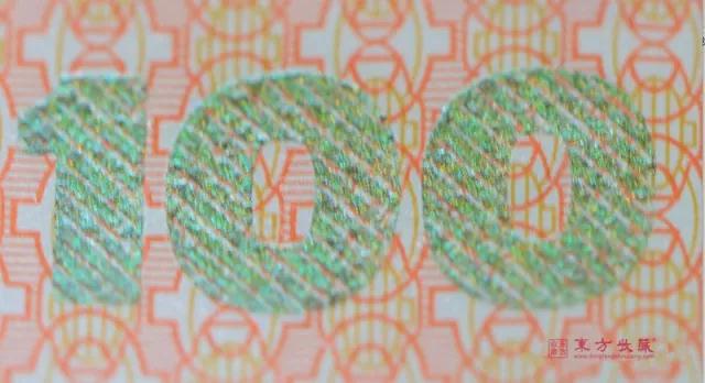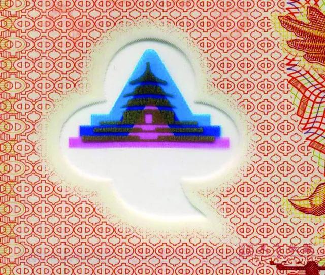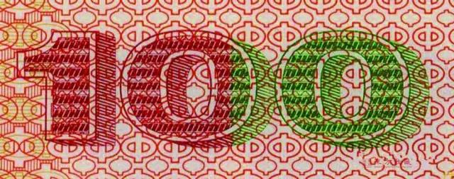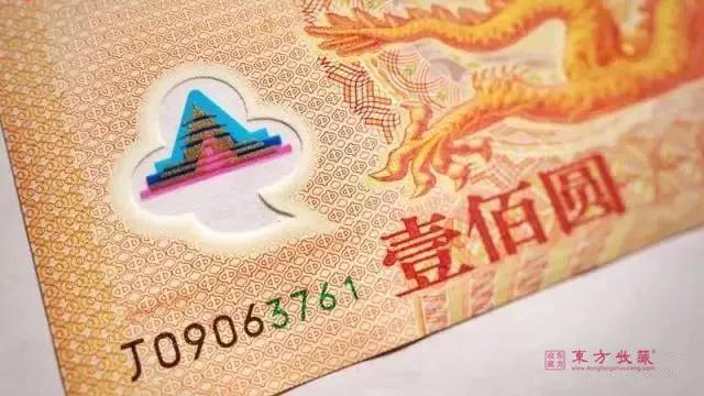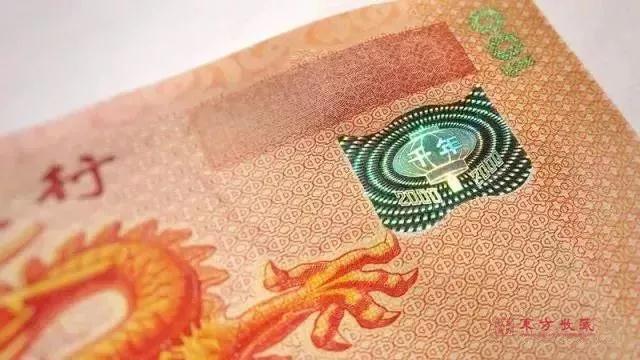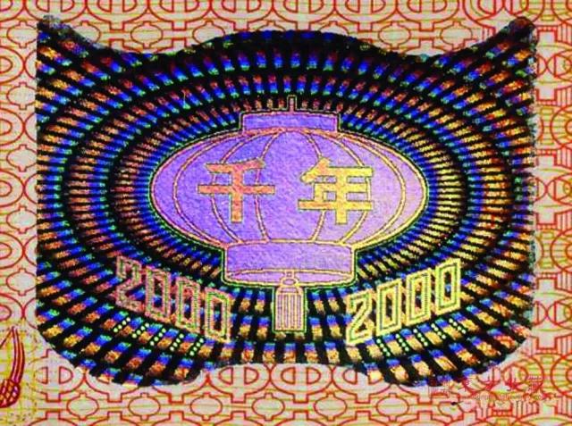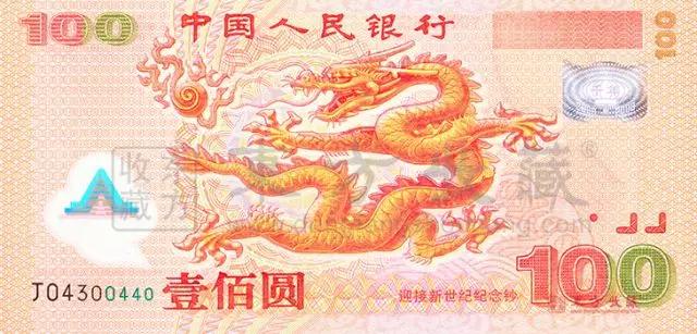 2000年又叫千禧年,是千年更替的大事件,央行为了纪念,发行了一张100元面值的塑料纪念钞,也是除香港外中国唯一一张塑料钞,制作极其精美,因其正面图案是龙,所以又被称为千禧龙钞。 展现民族特色的设计图案 平常发行的钱币,都是以风景、建筑、人物为票面的主景,而千禧龙钞则是以中华民族的图腾龙作为主景,用举世闻名的敦煌飞天造型来衬托,展现了中华文化的源远流长。 正面主景上的这条龙,原型是北京北海九龙壁中左侧第三条升龙。北海九龙壁是我国殿宇影壁中的精华,翻腾飞舞的龙具有高超的艺术水平,用在纪念钞票中作为主体,既生动又新颖。 但九龙壁中的这条龙是面朝右边的,为了票面构图的需要,就镜像后使其面朝左边,并将其横向拉长,龙尾伸出胶印纹饰,右侧上爪紧贴OVD全息膜。金黄的色调使票面色彩艳丽明快,一条黄金龙腾空而上,气势磅礴。 背面主景图案为迎接新世纪的代表性建筑中华世纪坛,中华世纪坛上空,乾坤台圆盘上,时空指针的左右,别具心裁地各安置上一个敦煌飞天的图案,底纹也有敦煌藻井图作衬景,显得简洁、大方、庄重,富于时代感。 透明视窗则以一朵梅花云为造型,像一扇玻璃窗户,明亮洁静,在窗户的中上部,采用了金粉、天蓝、桃红三色重叠,印上巍峨壮美的北京天坛祈年殿。 全息激光防伪标志以一个抽象的飞翔风筝为造型,中央印有一盏大灯笼,上印“千年”的字样,在灯笼吊须的左右端,各印有“2000”字样,随着角度方向的变换,标志会呈现出红、黄、蓝、绿的幻彩。 票面正面右上角的“100”字样,采用了光变面额数字技术,与票面垂直的角度观察为金色,倾斜一定角度则变为绿色。