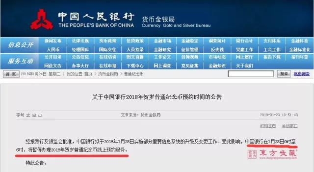 从此前央行发行公告以来,2018狗年生肖纪念币就一直是大家关注和讨论的重点,在经过漫长的等待之后,就在明天,终于要迎来第一批狗币了,于是小编整理了明天预售的详细情况,一起来看看吧! 第一批次 预约数量:1.5亿枚 预约时间:1月26日—1月31日 兑换时间:2月2日—2月11日 预约兑换的注意事项 1. 1月26日凌晨0点正式开始预约; 2. 第一批预约数量为3.5亿枚; 3. 每人预约、兑换限额为20枚; 4. 预约、兑换的有效身份证件必须为第二代居民身份证; 5. 每人最多可代领5人,需持被代领人在预约系统中登记的第二代居民身份证原件办理。 负责预约兑换的银行划分 中国工商银行:上海、内蒙古、辽宁、吉林、广东和深圳、四川 中国农业银行:江苏、安徽、江西、山东、海南、贵州、西藏、青海、新疆 中国银行:天津、山西、福建、湖北、湖南、广西、重庆、陕西 中国建设银行:北京、河北、黑龙江、浙江、河南、云南、甘肃、宁夏 可以通过上述四家银行的营业网点、官方网站、手机APP、官方微信公众号进行预约,办理兑换工作则需要到约定营业网点柜面进行。 线上预约小技巧 1. 开始预约的前几个小时是高峰期,预约人数较多,可能会遇到登录不上、收不到验证码的情况,实在不行就早上起来再约。 2. 如果遇到预约完成后,收到了预约成功的短信,但系统里却查不到预约记录,不用着急,只要收到预约成功的短信,则表示已成功预约,可以放心。 3. 网上如果没抢到,可以到当地银行的网点去问问。 狗币换了新包装 今年发行的狗币还换了包装,不同于以往40枚一卷的规格,调整成20枚一卷,卷纸也变得更漂亮了,看起来非常迷你可爱,莫名让人想到小时候吃的山楂片…… 同时在卷纸上面,还有狗形象的剪纸图案,对于喜欢收藏整卷的藏友来说,也是一个小福利了。这么可爱的“二狗子”,难道你还不动心吗?! 首批预约可能出现秒光 相比较前两年的5亿天量,本次狗币发行只有3.5亿枚,首批数量也仅1.5亿枚,单人的预约量也从以往的每人40枚,缩减到了每人20枚,竞争压力不可谓不大。 此外,因为第一批狗币的预约时间正好在春节前,又是走亲访友、贺岁新春的首选,所以参与预约的人数也不会少。 最后,有一个非常重大的消息要告诉身在天津、山西、福建、湖北、湖南、广西、重庆、陕西等地区的藏友们: 中国银行拟于2018年1月28日实施部分重要信息系统的升级及变更工作,受此影响,中国银行在1月28日0时—6时,将暂停办理2018年贺岁普通纪念币线上预约服务。 也就是说,中国银行负责的上述地区的藏友们,1月28日是从6点开始预约的,不要搞错时间白忙活了。 提前获取2018年生肖狗币预售方式: 1、扫描或识别图中二维码 (长按,识别二维码直接预订) 东方收藏您身边的投资收藏专家 典藏专线:400-821-0007