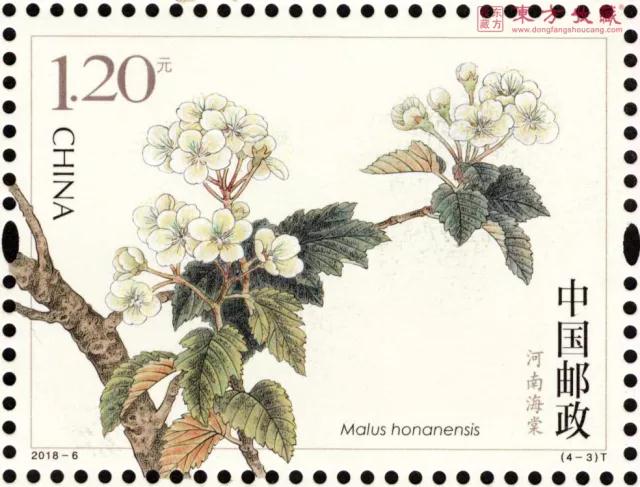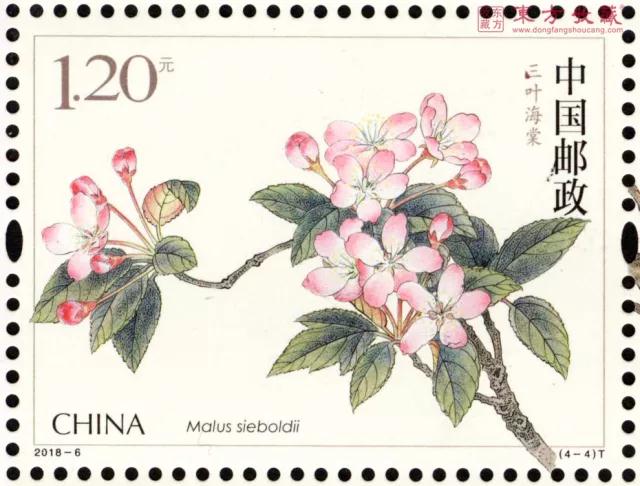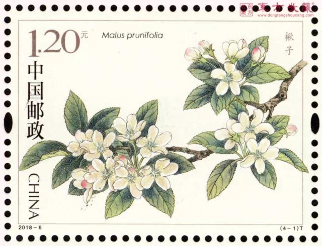 邮票志号:2018-6 发行日期:2018-03-25 图序/图名/面值 (4-1)T楸子1.20元 (4-2)T西府海棠1.20元 (4-3)T河南海棠1.20元 (4-4)T三叶海棠1.20元 邮票规格:40×30毫米 齿孔度数:13度 整张枚数:版式一16 枚、版式二8枚 整张规格:版式一200×150毫米、版式二130×190毫米 版别:胶雕套印 防伪方式:防伪纸张、异形齿孔、荧光喷码