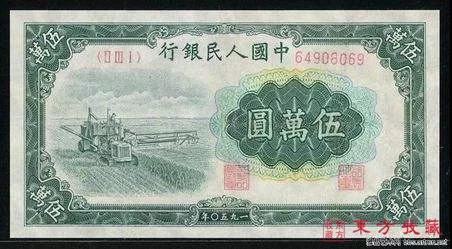 回顾一下我国的五套人民币,从第一套面值五万元的收割机开始,到第四套面值为两角、两元的人民币止,几乎凡是涉及绿颜色的人民币,全是收藏的热门。这其中,还包括2008年发行的10元奥运纪念钞,也是“绿币”,目前市场价值在6000元左右。 下面盘点一下目前价值不菲,最富有投资价值的“绿钞”。 1950年伍万元收割机,是中国人民银行于1953年发行的一款纸币。 作为当时最大面额的纸币,整体颜色以墨绿色为主,在纸币正面左侧是一辆正在运作的收割机,样式精美。1950年伍万元收割机在流通市场上的流通时间十分短暂,它于1953年发行,并在1955年停用,两年的时间,就马上退出流通市场。因银行回收相当彻底,更是显得珍贵。目前市价25万左右。 第二套人民币贰角,1955年3月1日发行,1971年11月只收不付,1999年1月1日停止流通。因为正面图案为火车头,所以也被收藏爱好者称为“火车头”。目前市价2000左右。 作为我国唯一一张面额为三元的人民币纸币,叁元井冈山从流通开始,就一直备受收藏着追捧,该纸币整体颜色呈浅绿色,发行于1955年3月1日,于1964年5月 15日停止收兑和流通,并进行回收。 因为这张纸币中间是井冈山龙源口石桥图景,又被称为叁元井冈山。目前市价5万左右。 背绿水印一角指中国人民银行发行的第三套人民币中的1962年版1角劵,背面为绿色,且有水印的钞纸,价格昂贵,是第三套人民币的“币王”,它的价格占到第三套人民币大全套价格的75%。 背绿水印一角价格高昂的原因之一是因为该纸币极易于同属第三套人民币的长江大桥(贰角券)混淆,故银行回收销毁。1966年1月10日发行看,1967年12月只收不付,因为稀缺性,还有很大的升值空间。目前市价2.5万元左右。 第三套人民币贰元1964年4月15日发行,1991年3月1日只收不付,2000年7月1日停止流通。正面图景是车床工人,正面颜色为深绿色,反面为浅绿色,非常漂亮大气,是众多收藏爱好者评为最经典的钱币。这张绿色的两元券,因存世量不多,一直是钱币市场的风向标。目前市价2000元左右。 第四套人民币的两元,被称为“绿精灵”或者“绿幽灵”。整体呈浅绿色,图案美观大气,价格一直在升,再加上最近刚刚发布第四套人民币停止流通的消息,或许在不久的几年内,它会造就像它的上一套两元(车工)的传说。