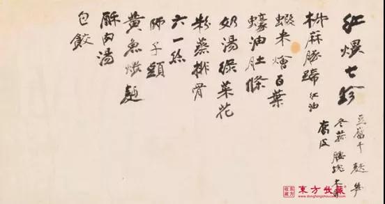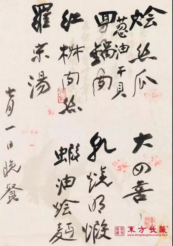 张大千的作品里经常出现蘑菇、胡萝卜、青笋、白菜等蔬菜,他在晚餐前也会一丝不苟地写好当晚想吃的菜交给厨师,而这一次拍卖的菜单,则是1977年至1979年张大千居台湾时的私人厨师徐敏琦的珍藏品。