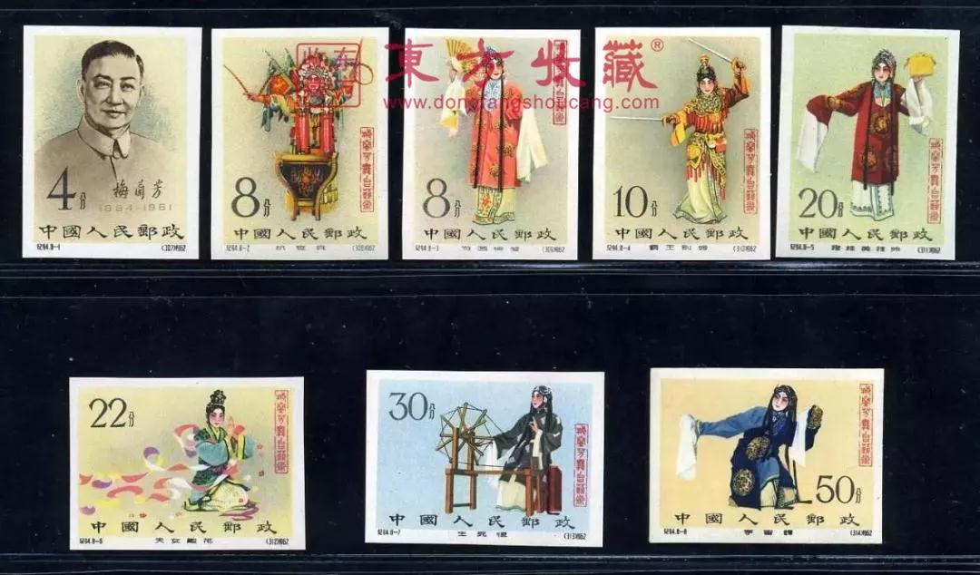 同时发行的还有一套同样内容但无齿的邮票,这也是中国第一次发行无齿孔邮票。当时,有齿的梅兰芳舞台艺术票发行了150万套,而无齿的发行量却很少,目前存世仅数千套,因此成为珍贵邮品之一。