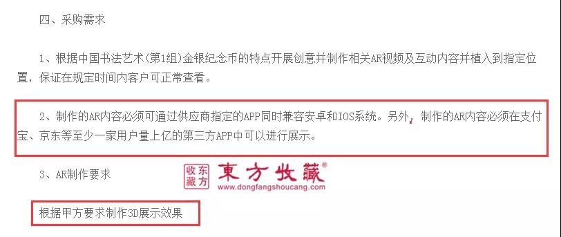 文中显示,根据中国书法艺术(第1组)金银纪念币的特点开展创意并制作相关AR视频及互动内容并植入到指定位置,保证在规定时间内客户可正常查看3D展示效果。