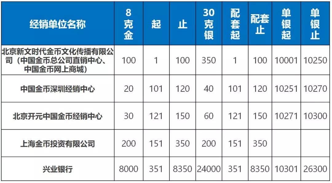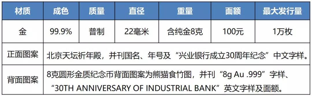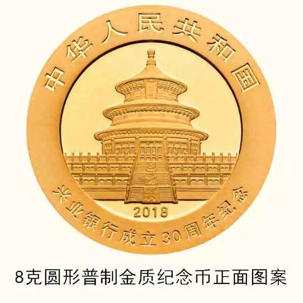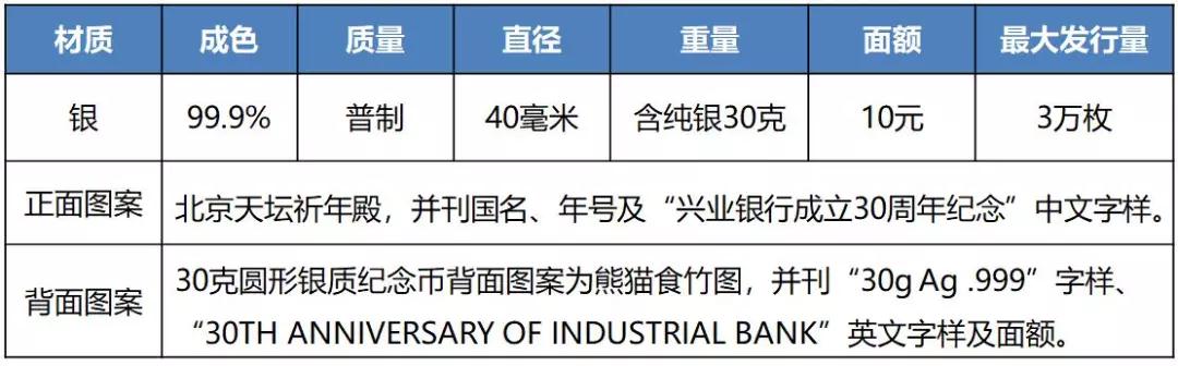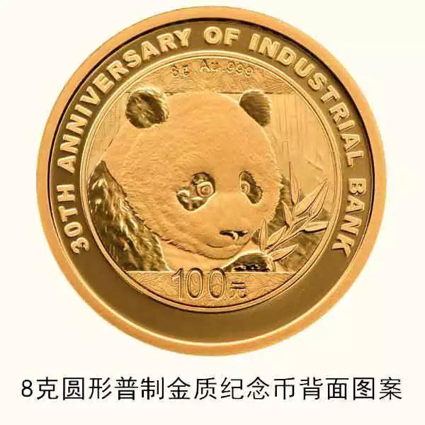 中国人民银行公告 〔2018〕第8号 中国人民银行定于2018年5月28日发行兴业银行成立30周年熊猫加字金银纪念币一套。该套金银纪念币共2枚,其中金质纪念币1枚,银质纪念币1枚,均为中华人民共和国法定货币。 一、纪念币图案 (一)正面图案。 该套金银纪念币正面图案均为北京天坛祈年殿,并刊国名、年号及“兴业银行成立30周年纪念”中文字样。 (二)背面图案。 8克圆形金质纪念币背面图案为熊猫食竹图,并刊“8g Au .999”字样、“30TH ANNIVERSARY OF INDUSTRIAL BANK”英文字样及面额。 30克圆形银质纪念币背面图案为熊猫食竹图,并刊“30g Ag .999”字样、“30TH ANNIVERSARY OF INDUSTRIAL BANK”英文字样及面额。 二、纪念币规格和发行量 8克圆形金质纪念币为普制币,含纯金8克,直径22毫米,面额100元,成色99.9%,最大发行量10000枚。 30克圆形银质纪念币为普制币,含纯银30克,直径40毫米,面额10元,成色99.9%,最大发行量30000枚。 三、该套金银纪念币由深圳国宝造币有限公司铸造,中国金币总公司总经销。销售渠道详见中国金币网。 中国人民银行 2018年5月22日 兴业银行成立30周年熊猫加字金银纪念币图案 来源:中国人民银行官网