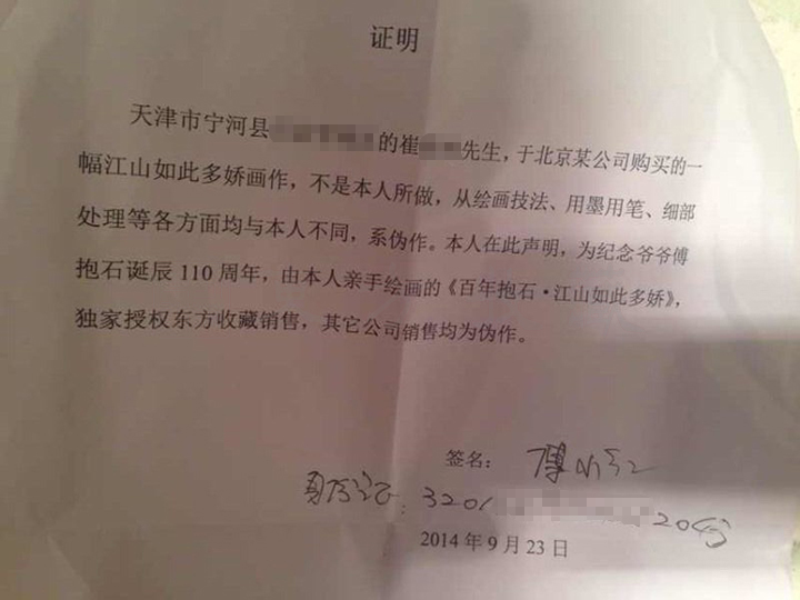 在傅小红大师与观众互动时,一位来自天津的的崔先生拿出自己在北京某公司购买的一幅《江山如此多娇》请傅小红大师鉴定,傅小红在认真观察了该幅作品绘画技法、用墨用笔、细部处理等各个方面后,确定该作品并非其亲绘画作,系伪作。随后傅小红大师开出鉴定证明,特别强调《百年抱石·江山如此多娇》独家授权于东方收藏公司销售,其他公司卖出的均为伪造品。