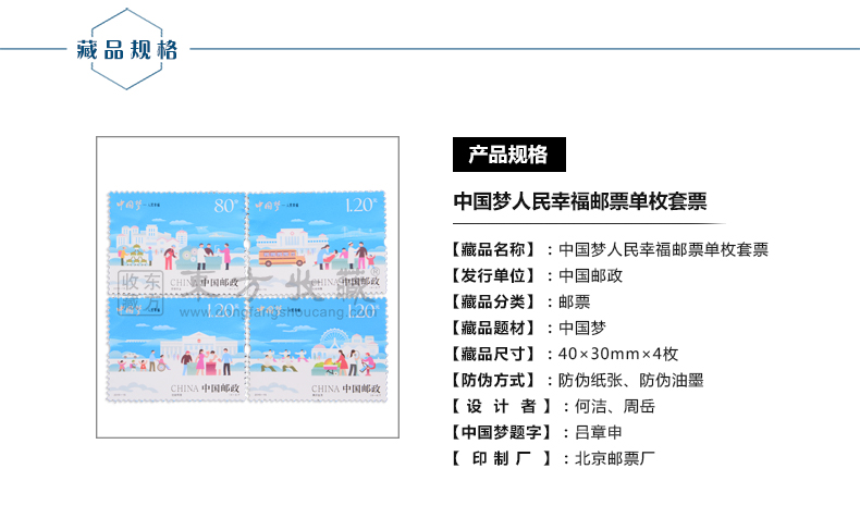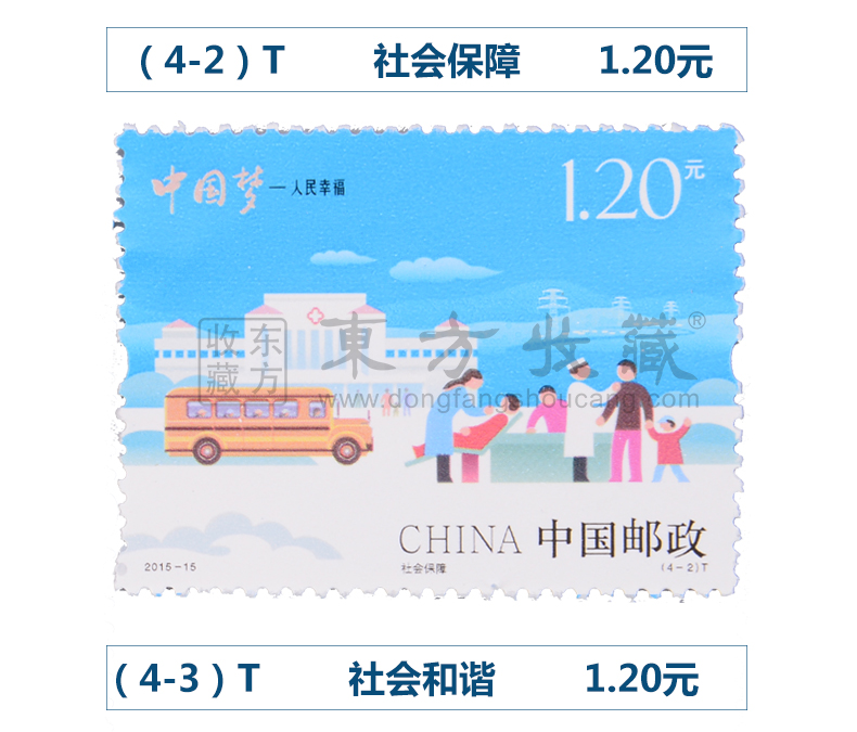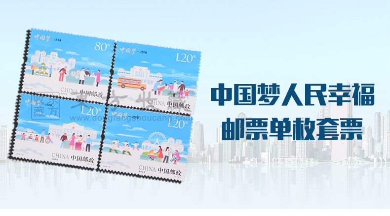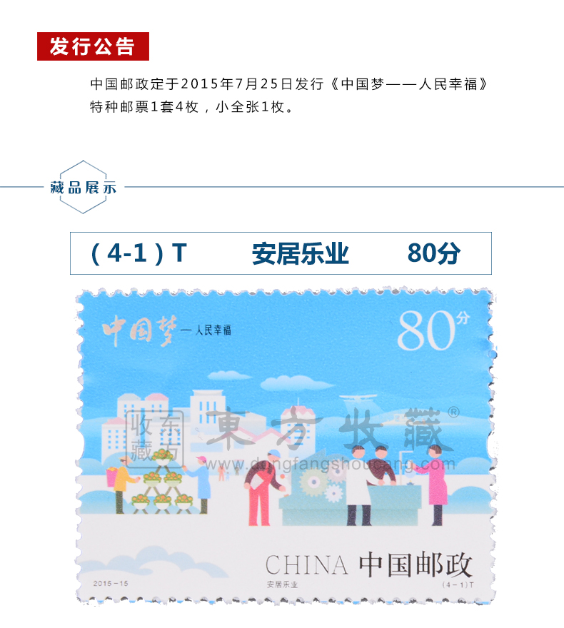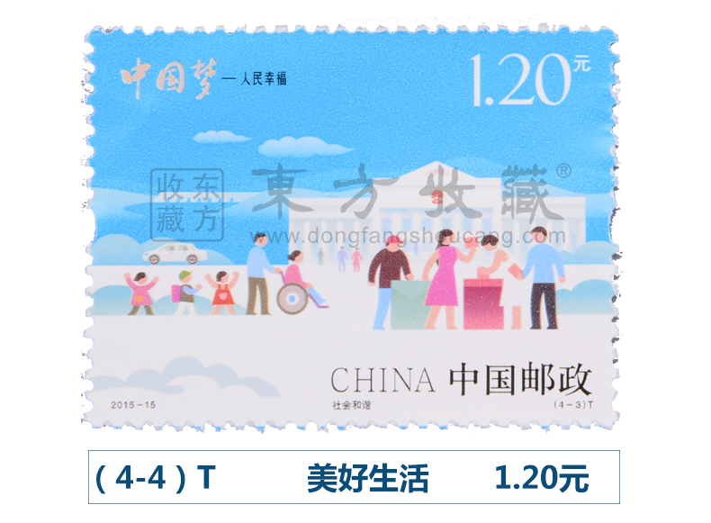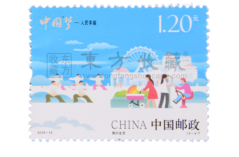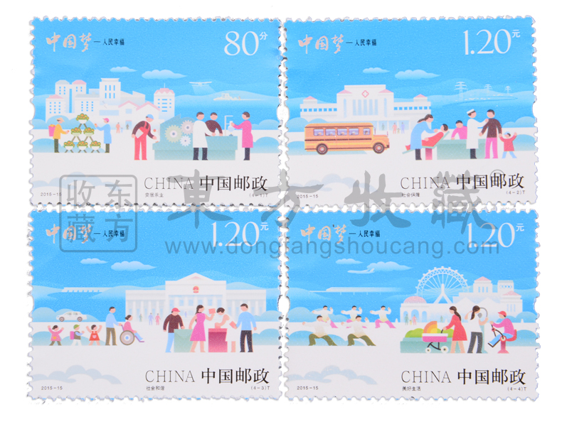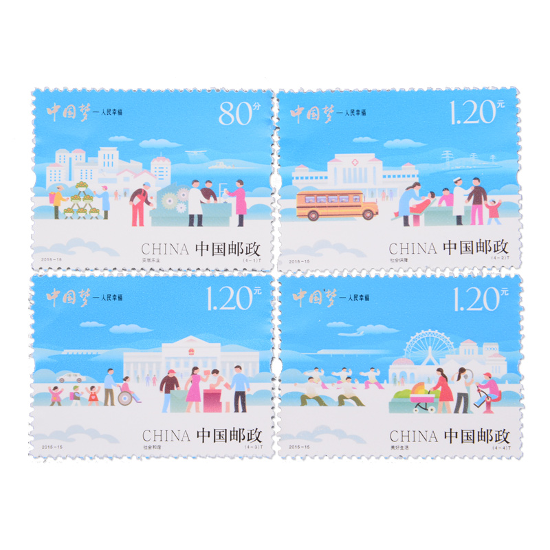 中国邮政定于2015年7月25日发行《中国梦——人民幸福》特种邮票1套4枚,小全张1枚。
