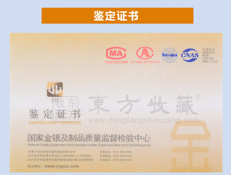 东方收藏承诺遵守商业道德,诚信为本、依法经营,接受会员监督。东方收藏所有藏品均有相关机构出具的证书,如果您发现虚假藏品,即可假一赔十。