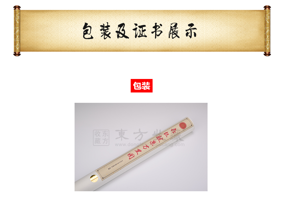 东方收藏承诺遵守商业道德,诚信为本、依法经营,接受会员监督。东方收藏所有藏品均有相关机构出具的证书,如果您发现虚假藏品,即可假一赔十。