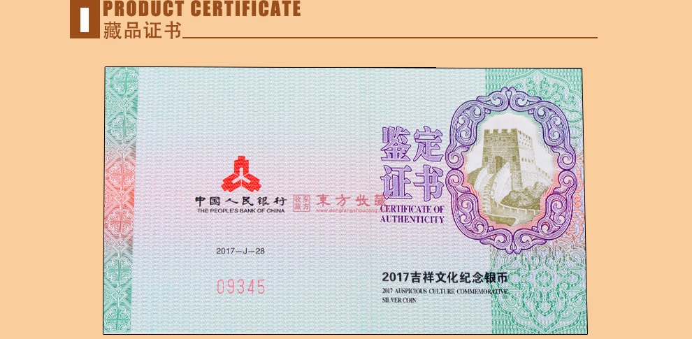 东方收藏承诺遵守商业道德,诚信为本、依法经营,接受会员监督。东方收藏所有藏品均有相关机构出具的证书,如果您发现虚假藏品,即可假一赔十。