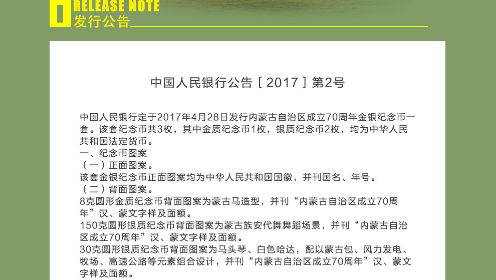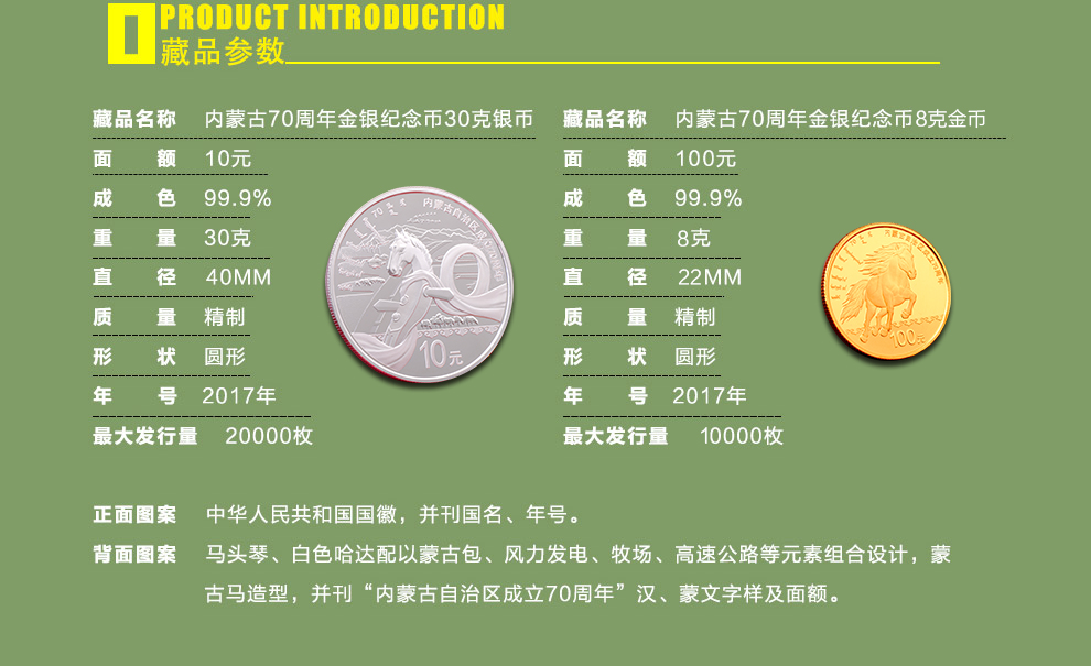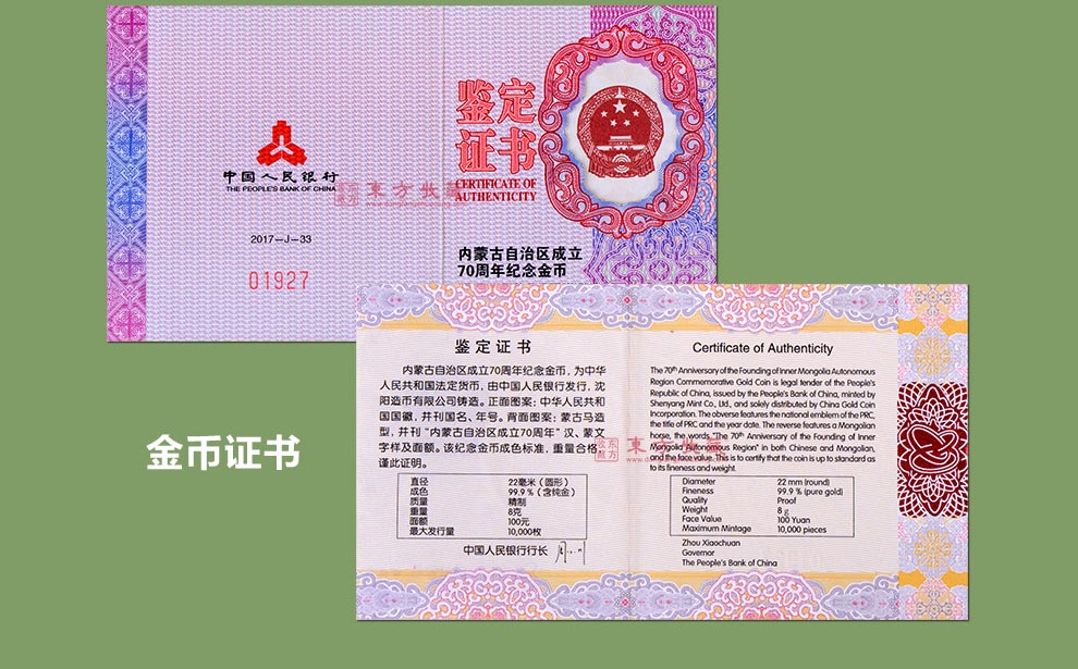 2017年内蒙古自治区成立70年金银纪念币 8克金币+30克银币