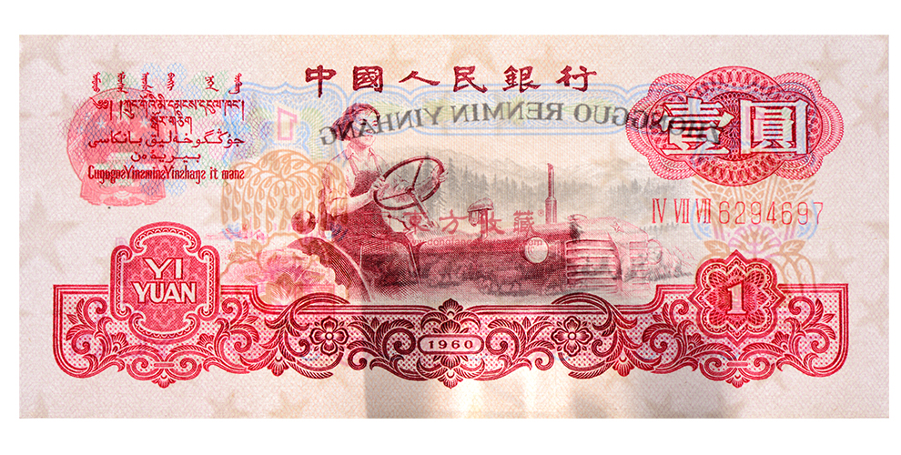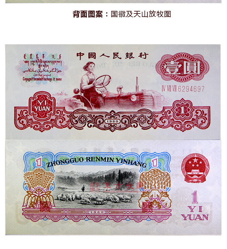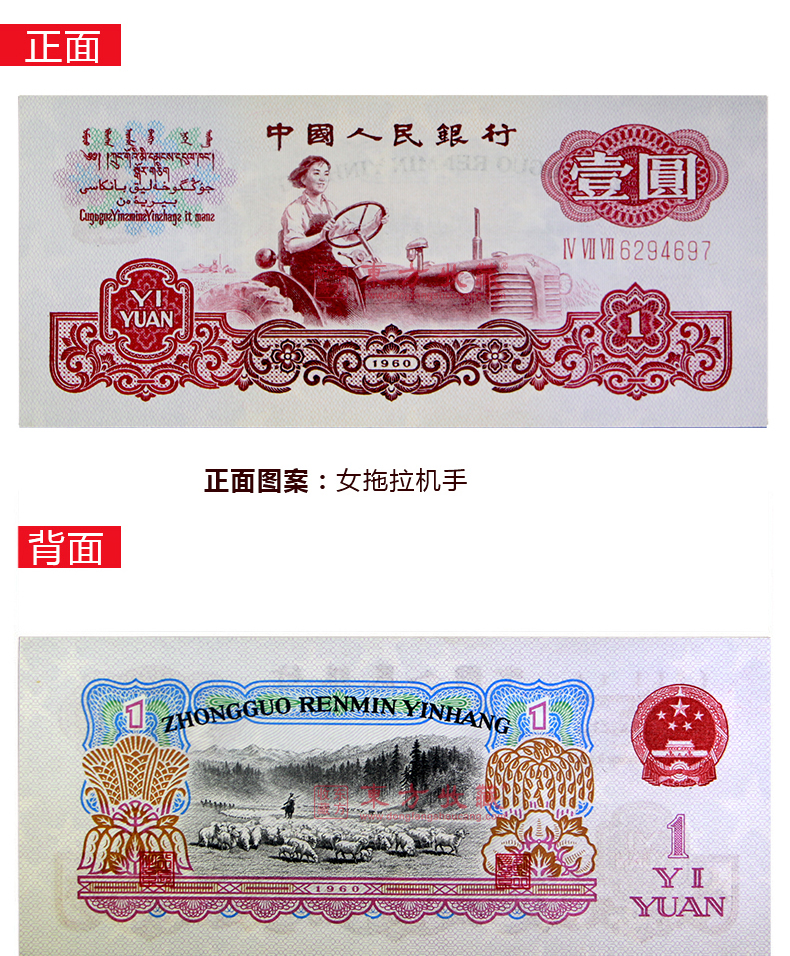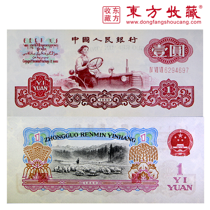 第三套人民币 1960年1元女拖拉机手 五星水印 三冠号 单张 全品相