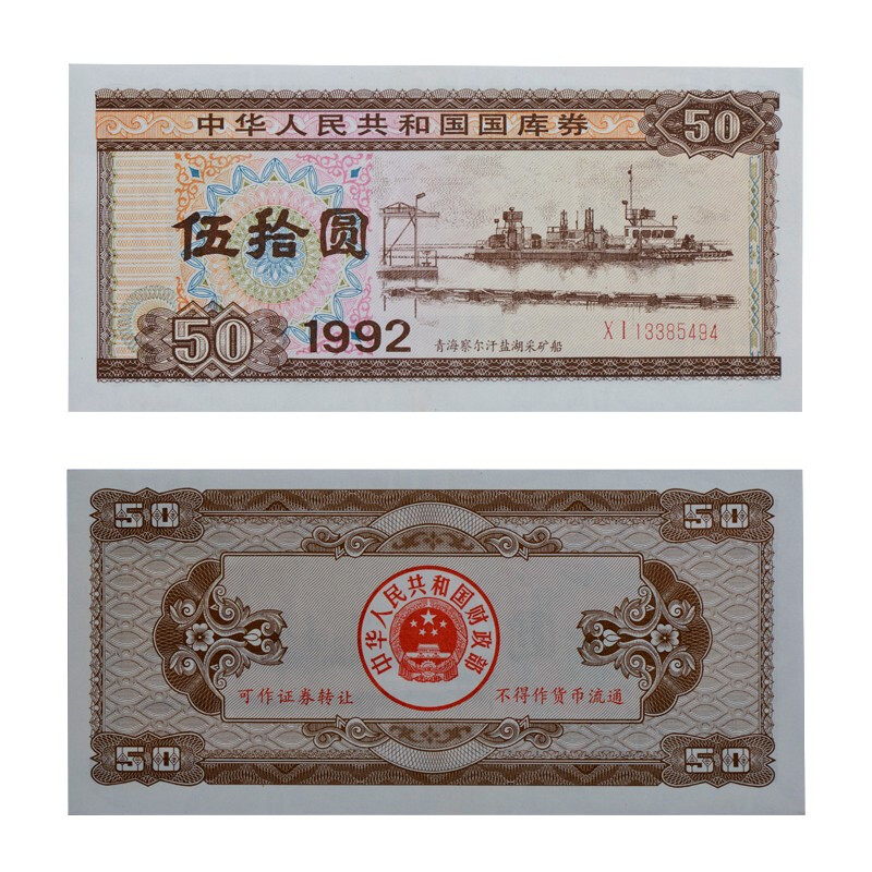 中国国库券 1992年50元(第二期) 青海察尔汗盐湖采矿船 全品