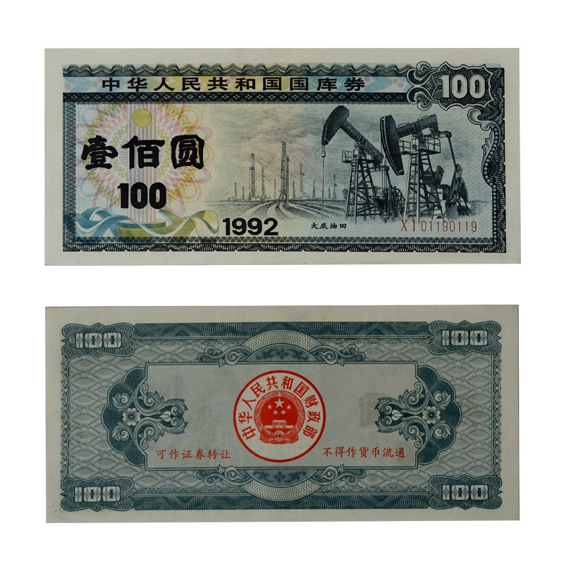 中国国库券 1992年100元(第一期) 大庆油田 全品
