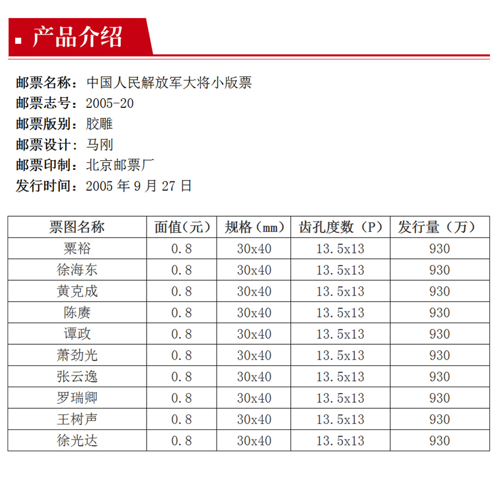 2005-20 中国十大将邮票 小版票