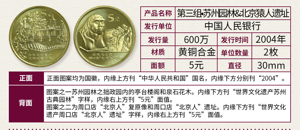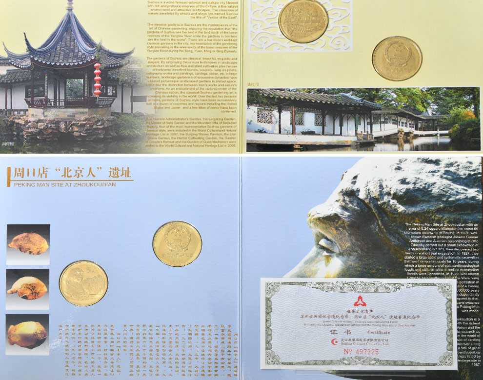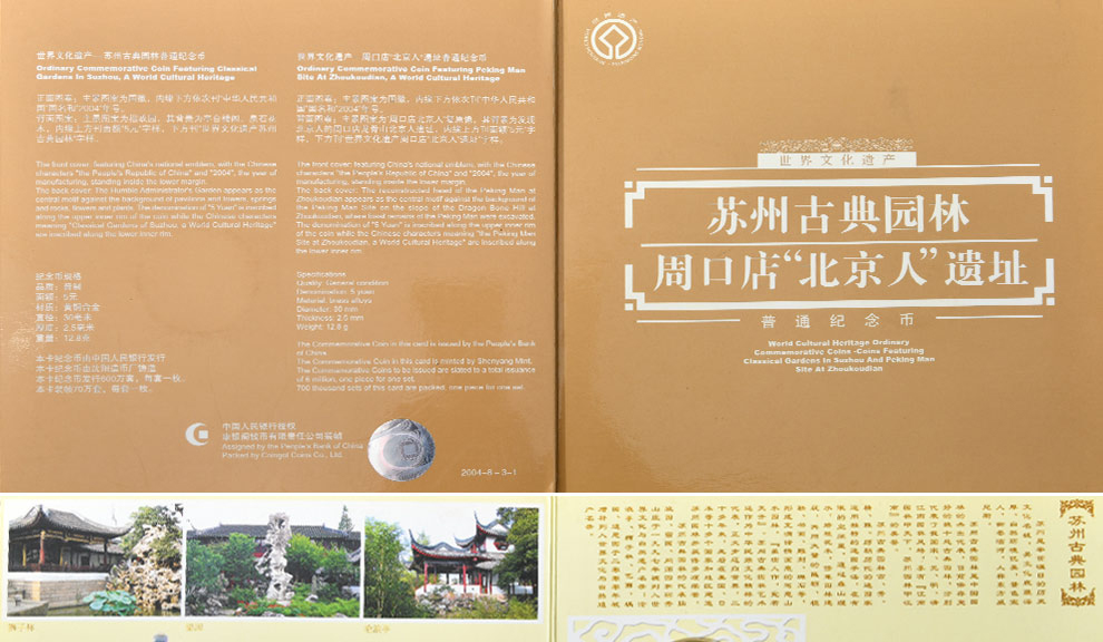 中国世界文化遗产纪念币 2004年苏州古典园林、周口店北京人遗址 康银阁装帧版