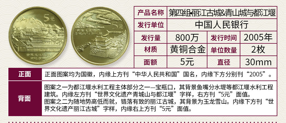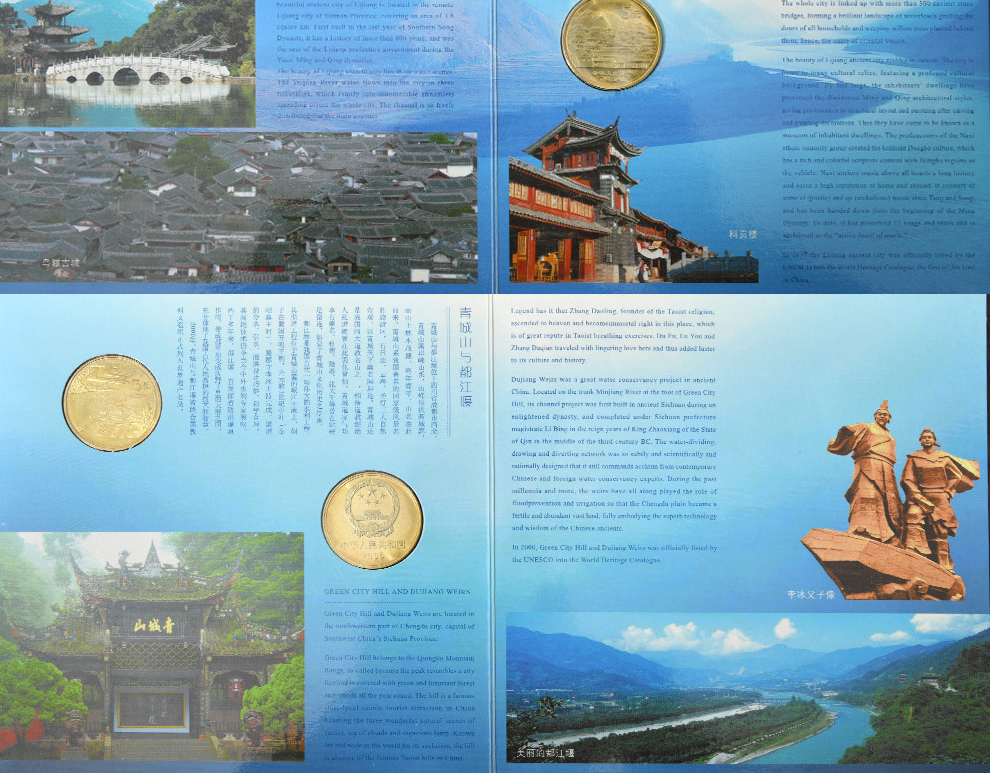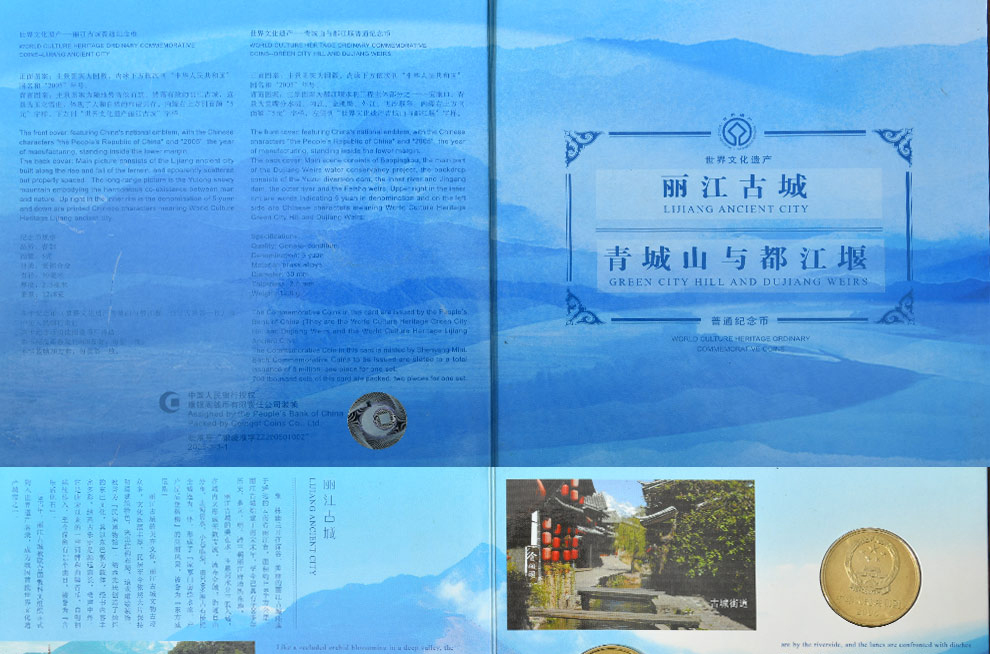 中国世界文化遗产纪念币 2005年丽江古城、青城山与都江堰 康银阁装帧版