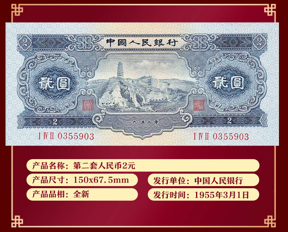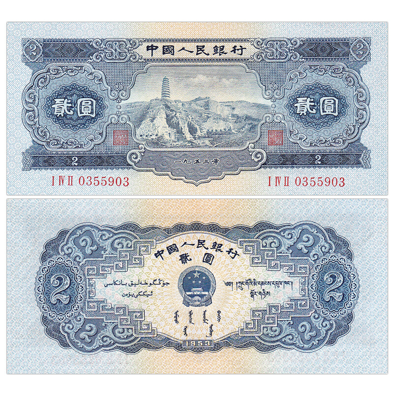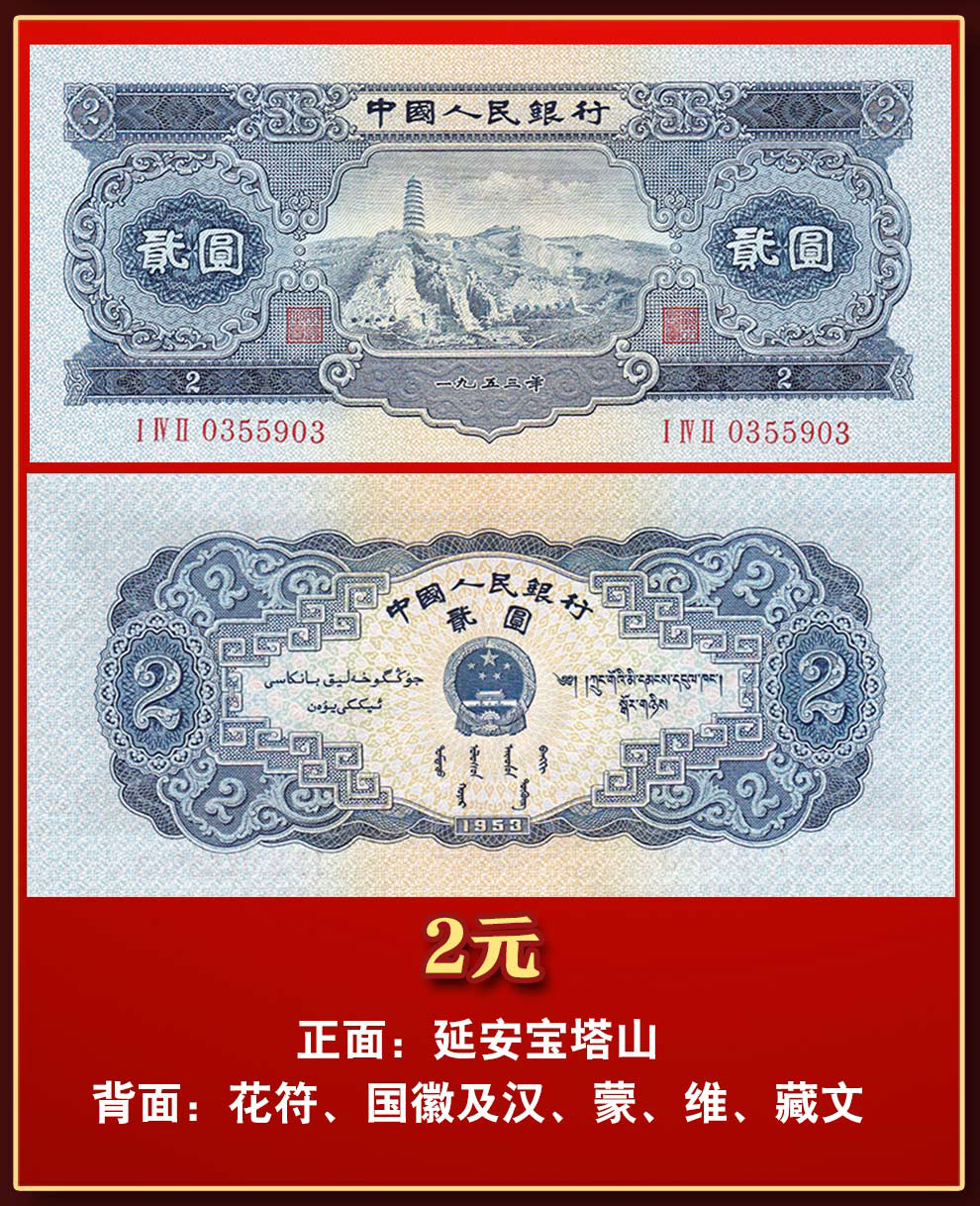 第二套人民币 1953年2元 宝塔山 全新