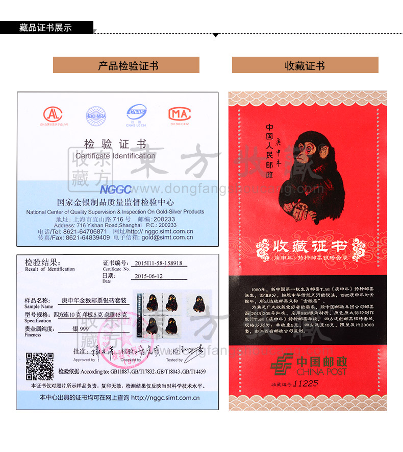 东方收藏承诺遵守商业道德,诚信为本、依法经营,接受会员监督。东方收藏所有藏品均有相关机构出具的证书,如果您发现虚假藏品,即可假一赔十。
