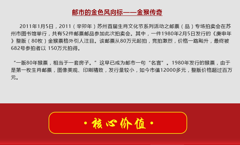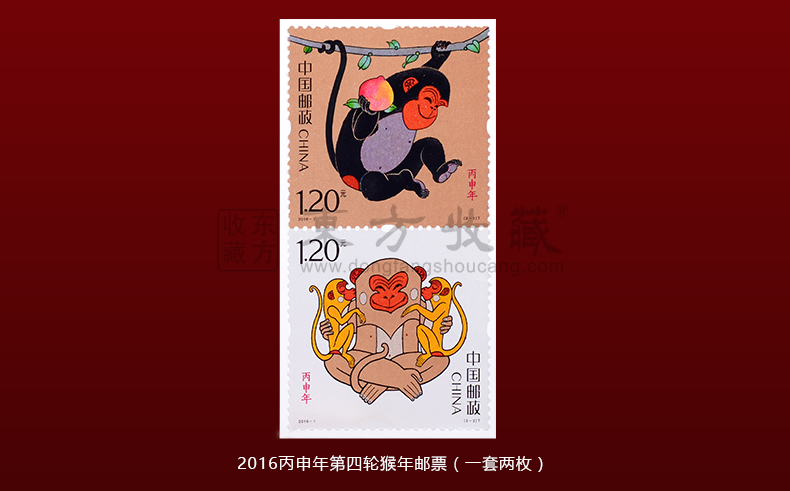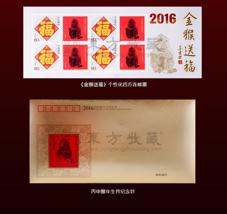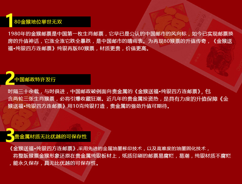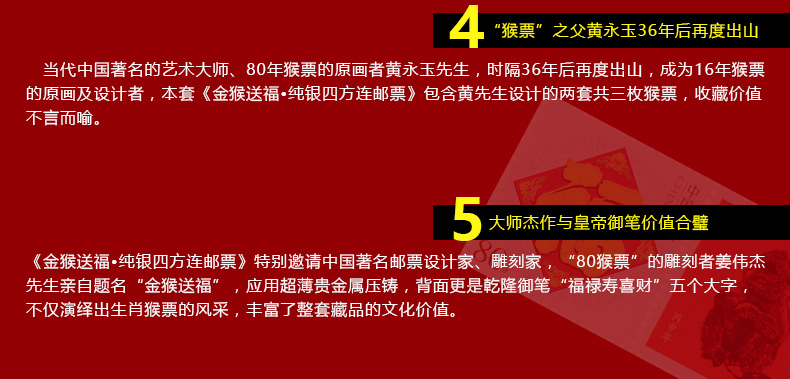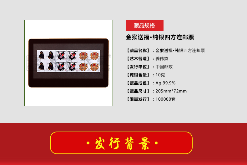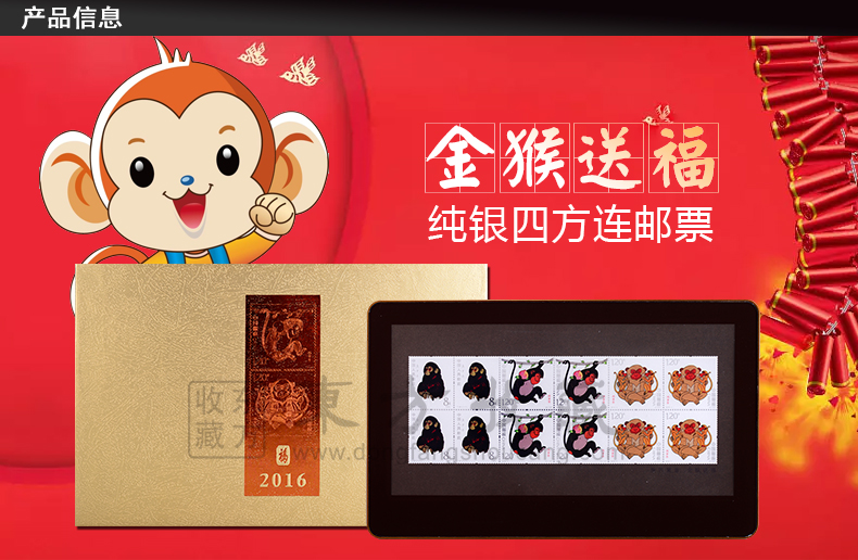 2016年金猴送福纯银四方连邮票 猴年邮票