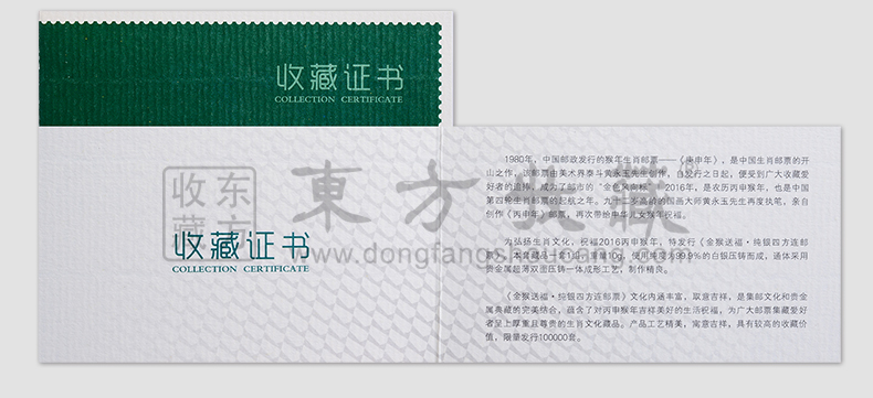 东方收藏承诺遵守商业道德,诚信为本、依法经营,接受会员监督。东方收藏所有藏品均有相关机构出具的证书,如果您发现虚假藏品,即可假一赔十。