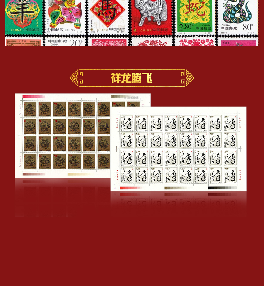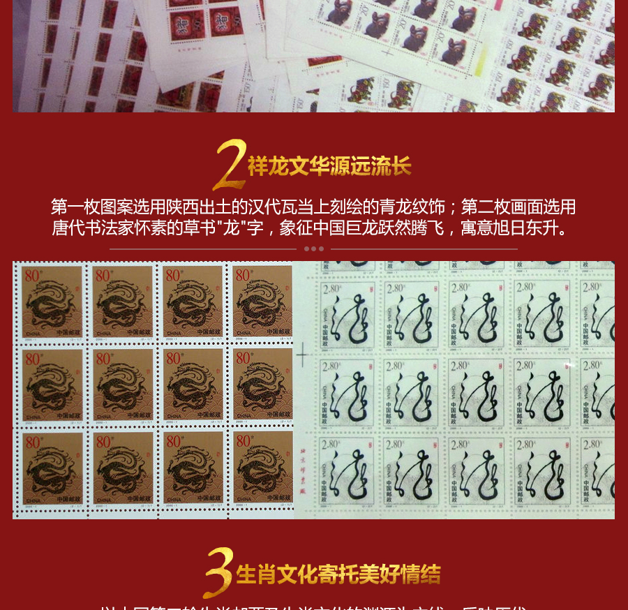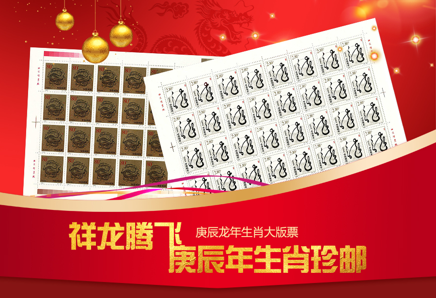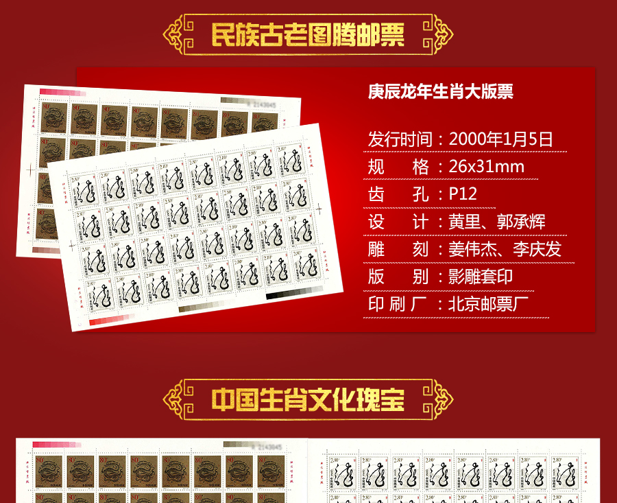 中国从1992年开始发行第二轮生肖邮票,每年发行两枚生肖邮票,到2003年止共发行24枚生肖邮票。中国邮政在2000年1月5日发行了第二轮生肖邮票庚辰龙年大版票。该大版票包括面值“神龙腾飞”邮票和“旭日东升”邮票各一版,每版32枚。“神龙腾飞”面值为80分,发行量为:9527万枚;“旭日东升”面值为2.8元,发行量为:7380万枚。两枚邮票设计:黄里、郭承辉;雕刻:李庆发、姜伟。北京邮票厂印刷,影雕套印。