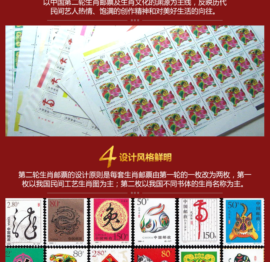 第二轮生肖邮票以生肖文化的渊源为主线,意在品味古老生肖对人类命运的影响,反映出了历代民间艺人热情、饱满的创作精神和对美好生活的向往。生肖文化作为中国特有的传统文化,受到了收藏者的普遍追捧。第二轮生肖版票因其设计新颖、所含信息量大,意义深刻,更是备受欢迎。