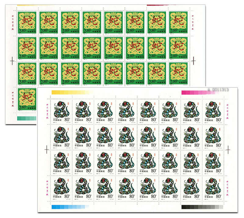 中国邮政定于2001年1月5日发行《辛巳年》蛇票,全套2枚。邮票由呼振源设计雕刻。邮票图案为身绘彩色小花,主体仿若绿色线条织就而成的小蛇。字的部分为将用中国传统剪纸艺术创作的双蛇顶日吉祥图案。
